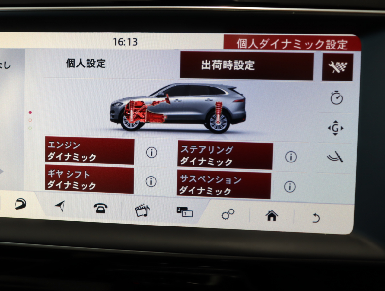 ●AWD●8速オートマチックトランスミッション●ジャガーシーケンシャルシフト付8速電子制御オートマチックトランスミッション●インテリジェントストップ/スタート/●オールサーフェスプログレスコントロール(ASPC)●DSC(ダイナミックスタビリティコントロール)●トルクベクタリングバイブレーキ●アダプティブダイナミクス●コンフィギュラブルダイナミクス-スロットルレスポンス調整、ステアリングレスポンス調整、ギアシフト調整、サスペンス調整(アダプティブダイナミクス同時装着時)●ヒルローンチ(スタート)アシスト●車速感応式電動パワーステアリング●クルーズコントロール