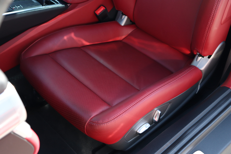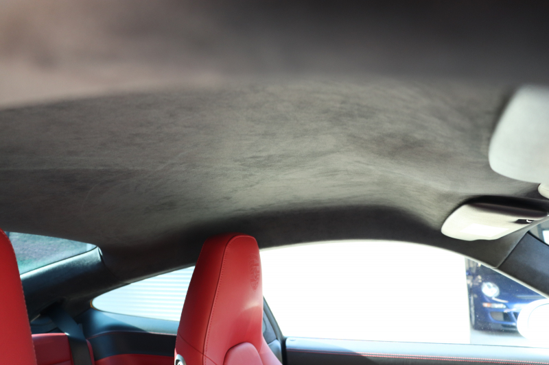 ツートンレザー(ブラック × レッド)とカラーインストルメントパネル(レッド)が揃うこの仕様は、オーダー時のこだわりが随所に感じられます。シートの状態は良好で、ステアリングやシフト周りも使用感は少なく、走行距離以上にコンディションが良い印象です。アルカンターラルーフライニングの毛並みも綺麗に保たれています。