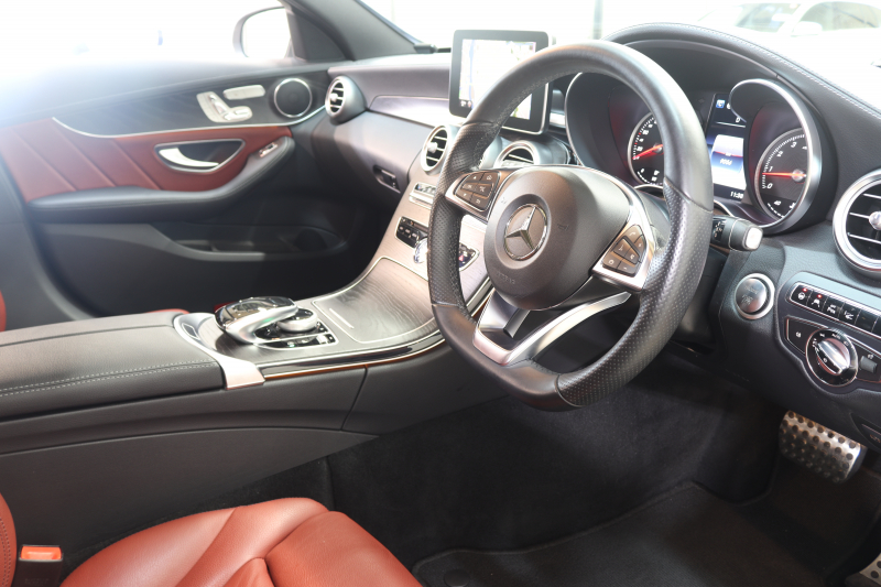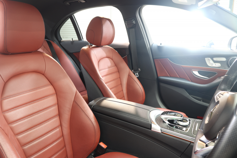 メルセデスベンツ Cクラス C200 AVG AMGライン レザーエクスクルーシブ&レーダーセーフティPKG 1オーナー キーレスゴー 赤本革 ヘッドアップD HDDナビTV BT音楽 バックカメラ PTS LEDライト 自動トランク ハンズフリーA AMGエアロ&18AW エアサス 7AT 2年保証