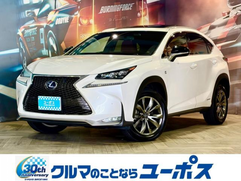 レクサス NX 300h Fスポーツ ムーンルーフ 純正ナビレクサスメーカーナビ(フルセグTV/CD/DVD/Bluetooth/USB/AUX) 三眼LEDヘッドライト 本革シート ベンチレーション ルーフレール パワーバックドア サイドカメラ
