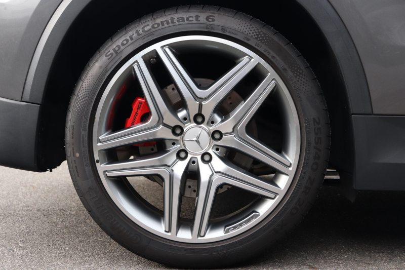 外装は落ち着いたマウンテングレー。AMGスタイリングパッケージによる精悍なフォルムに、20インチAMG 5ツインスポークアルミホイールとAMGレッドブレーキキャリパーが映える、上品かつ力強い組み合わせです。光の角度でわずかに経年の痕が見える程度で、全体としてコンディションの良さが伝わります。