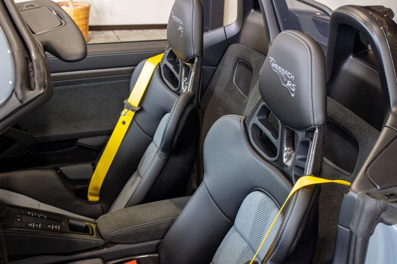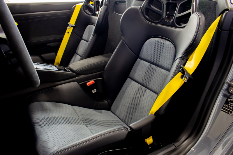 軽量化の象徴であるファブリック製プルループ。標準ブラックからレーシングイエローへ変更し、シートベルトやメーターとのカラーコーディネートを統一。