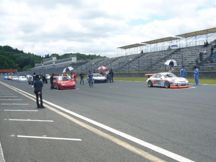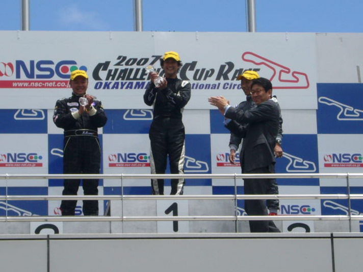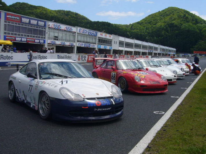 なんとGTIカップの同日におこなわれたポルシェレースに 私のツーリング友達(ポルシェ高速道路安全爆音会?)が参加されていました予選は二番 ポールは997カップカー早い早い しかしレースは 終わるまで何がある解りません 私の記憶によれば6周目あたりで 997カップがヘアピンでスピン二番手につけていた私の友達が うまくかわしトップにたちそのままゴール終わって見れば お立ち台のまん中 私もシャンペンのかかったレーシングスーツをクリーニングにだしたいです 20日は岡山は私にとって最高の一日でした |