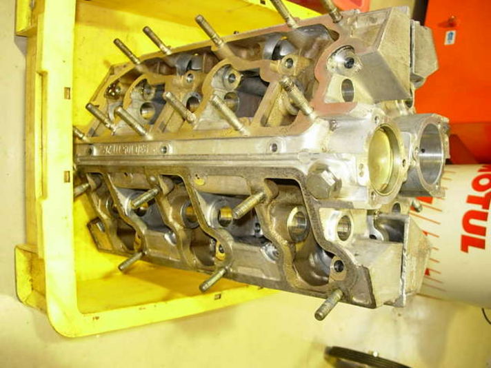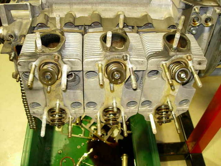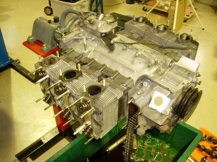 綺麗なヘッドとカムハウジングには液状のガスケットが塗られ合わせていきます。各バンク一気筒づつばらばらになる三つのヘッドの高さは、非常に精度を必要とする構造です。精度の高さは素晴らしいです。さすが・ポルシェ社!