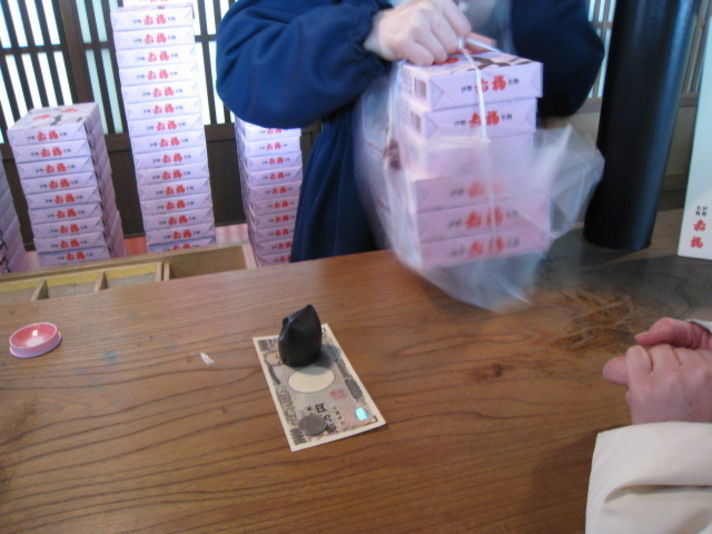 写真は おかげ横丁のにぎやかな様子と赤福本店そしてお土産赤福を購入したところです (水曜日は比較的.休みのお店が多く観光スポットもすいているので赤福餅を購入するのに5分ぐらいで購入できました)