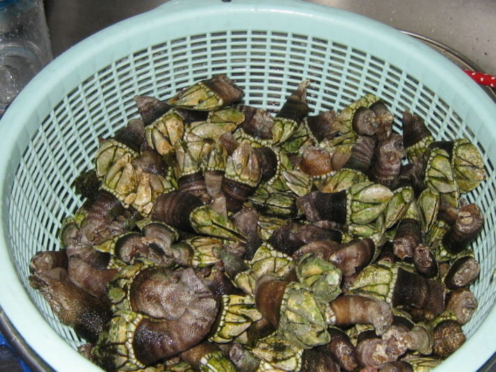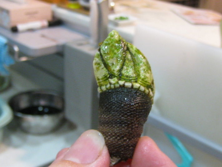 単純に塩でゆで.そして亀の手首のあたりをむくと 最後の写真の白い実を食べます 味は大きな貝の口の部分の感触です
