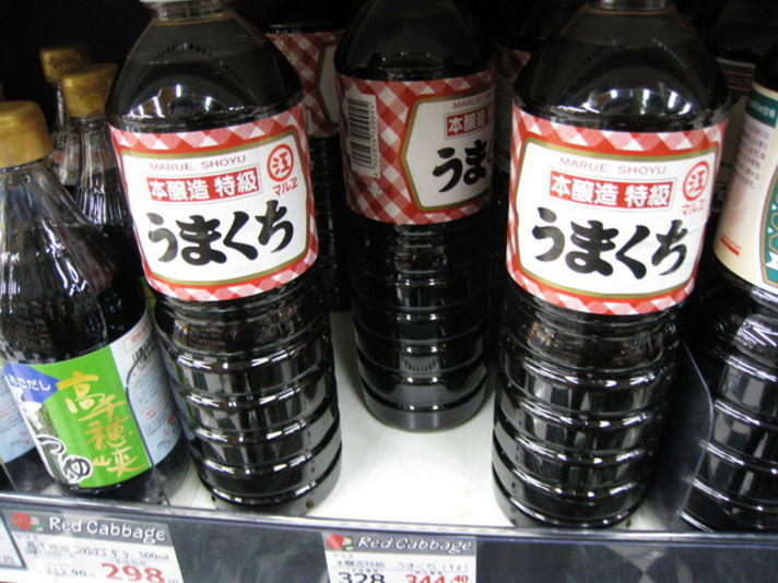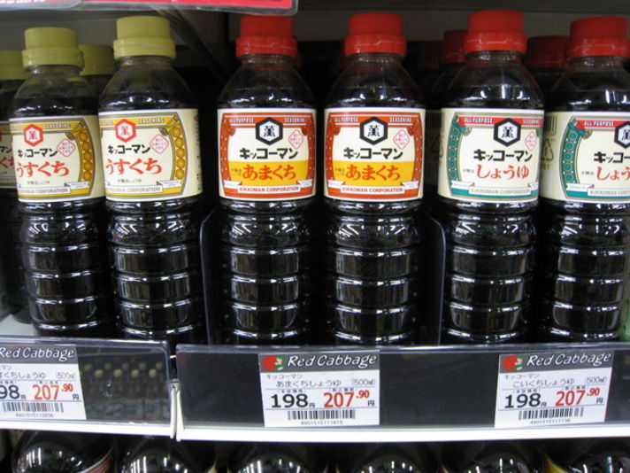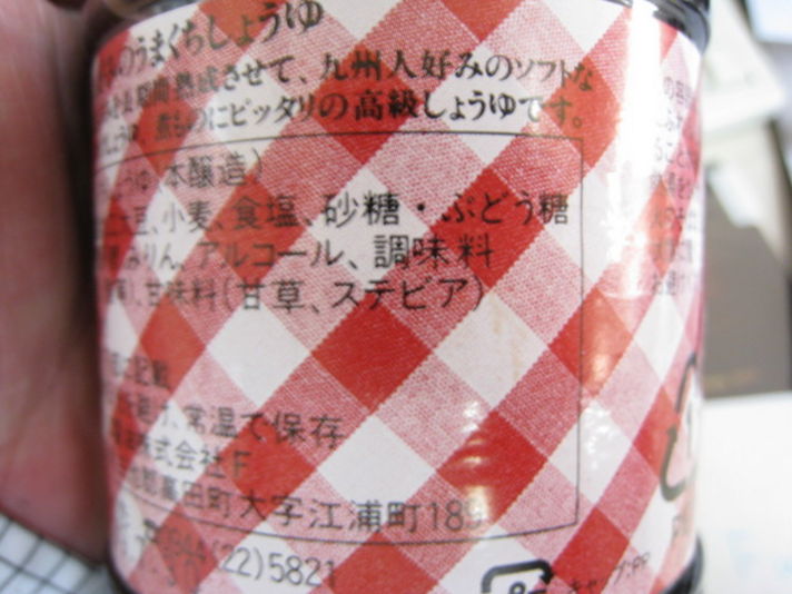 お店の方に聞くと九州の南にいけば.いくほど醤油は甘くなるとの事........お刺身醤油の味は 関西では考えられないぐらい甘く 御餅を食べる時に作る 砂糖醤油なみです 食いしん坊な私の発見です 皆さんも旅に行かれたときに地元のスーパーをのぞくのも おもしろいですよ