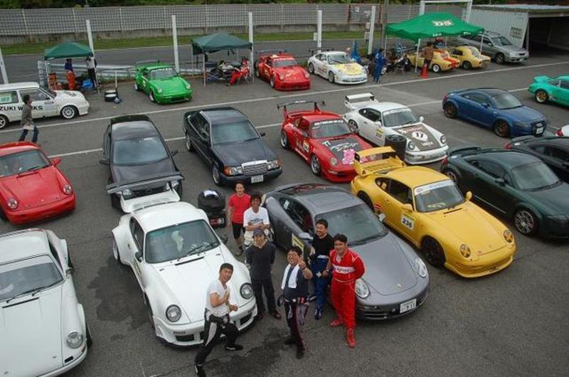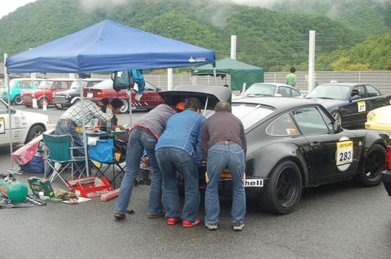 911DAYS大人の運動会の良いところ 走っていないときは 皆で和気あいあいとポルシェ談議です 最初の写真はエンジンルームを皆で点検中?