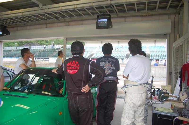 これ普段では中々見られないショットですよ...ポルシェ好きならでわのショット........そして 次の写真は他のレースを皆でモニターを見ながら あや こやと秘密談議.......(笑)......最後は911DAYSの日比野編集長を囲みメタボ対策談議をピット上からのショットです...(笑)