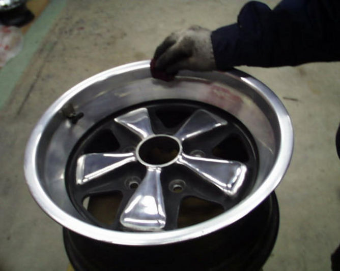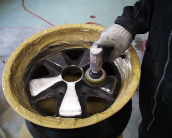 写真で分かるようにまず マスキングをして 盛り上がっている部分の黒を 削りとっていきます この作業が仕上げを大きく左右する工程の一つです 削り過ぎず 形をそろえいきます 次に光っている部分を丁寧に磨きこんでいきます 最後に一度綺麗に洗い油ぶんを落とし乾燥し 当店自慢のガラスコーティングを吹き付け出来上がりです (当店自慢の職人.村田の仕事です 丁寧 綺麗) 今回は16インチの8JのRワンセットで約一日半の作業工程です