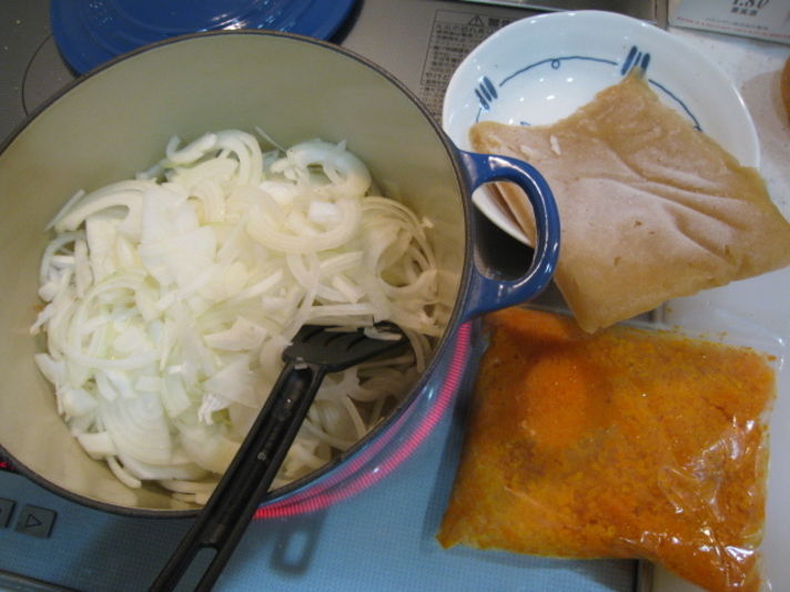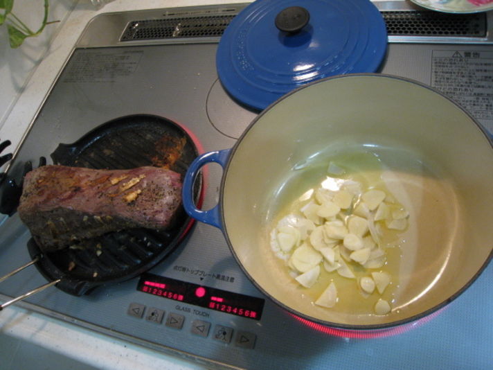 タンが焼きあがれば 私のお気に入りの鋳物のホーロー鍋 ル.クルーゼ にバターを焦がさないように溶かし スライスしたにんにくを時間をかけて炒めます そのあとスライスした玉ねぎを炒め 右の写真の鍋の横にある 以前 林檎が沢山あったときに仕込んだ自家製林檎ペーストと人参をみじん切りしてバターでいためたペーストを焦げないように炒めておきます 左の写真は大人の男の料理のこだわりの にんにく 玉ねぎ そして 写真に見える青い鍋がル.クルーゼの鋳物のホーロ鍋はフランス製ですが IH対応で煮込み料理には最適の鍋です 洋物の煮込みは一生物のポルシェと同じル.クルーゼの鍋が最高です パート3に続く |