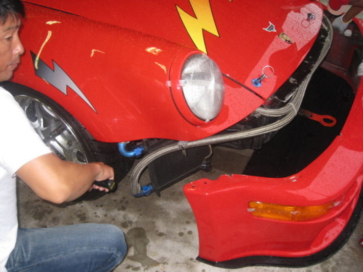 予選セミウェットの路面で終わり そのあと また雨が降てきました ここで決勝では路面は完全にウエットです 私はラジアルタイヤで走行しましが Sタイヤでの走行はとても難しく クレヨン2号車は初のフロントローで決勝となりましたが レインタイヤが 無いので安全のために 決勝は仲間のクレヨンナカニシ号と友に棄権されました でもこのような状態で走ることを断念する 勇気が大切です 大事なポルシェを壊してしまってはどうにもなりません 実際に決勝は雨こそ やみましたが(晴れ男の私のパワー全快)全てのコーナーがまるで氷の上を走っている危険な状態でした 路面の温度が上がらないので 普段の空気圧セッティングでは無く雨の空気圧セッティングで走るために 前後ドライ時の温感時のセッティングまで空気圧を上げ (右は0.1下げて)ゆっくりと走りましたが 1コーナーのポルシェラインのイン側が最近舗装されたばかりなので 雨でアスファルトの油が浮いており ゆっくり走ったのにもかかわらず 三周目で大回転しました(笑) そんな中写真のレインタイヤに履き替え準備をしている ポールトゥーウィンを決めたレッド930の写真です タイヤの履き替えには クレヨン二号とクレヨンナカニシ号の二人が手伝っておられました これ911DAYSポルシェレースの趣旨である 皆か仲良く和気あいあいシーンです 決勝の成績は写真でお解かりいただけると思います 上位は全てレインタイヤでした |