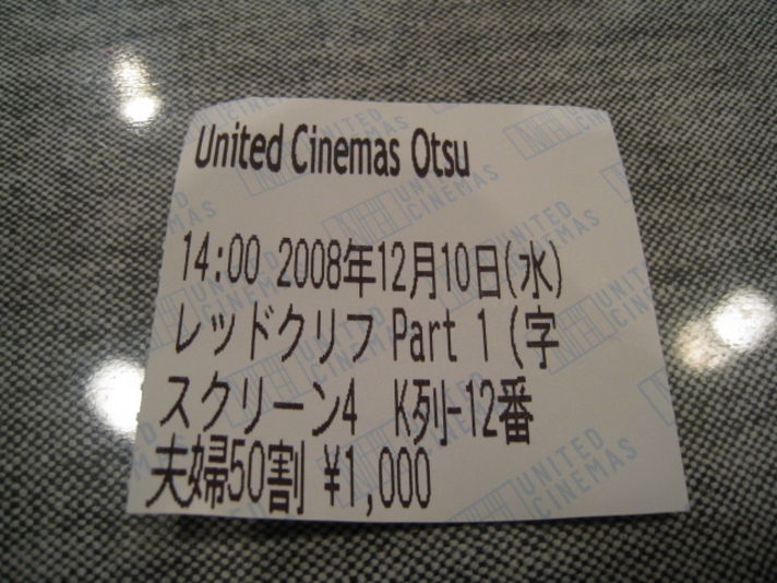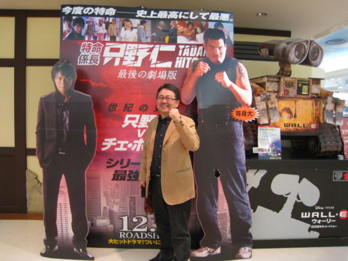 今日の休みに 以前から見たいと思っていた映画に行ったところ (水曜日はレディーディーなので家内は1000円) チケットを購入に行くと 窓口でどちらか50歳以上の方はおられますかは?もしどちらかが50歳であれば.......夫婦でなんと2000円で映画が見られるとのこと これは得です! 50歳になってガッカリしている今日この頃ですが得する事もありますよ (チケットを販売する方に私が50歳に見えたのは かなりショックです) ところで 今回見た映画レッドクリフ 上映時間二時間以上ですが 展開の早さと映像の迫力などて見ごたえのある映画です 今年私の見た映画なかでナンバー1でした 是非皆さんも見てください必ずパート2を見たくなること間違いなし その前に少しだけ三国志のことを勉強すると面白さ倍増です (私は以前から息子が三国志ファンなので 見て息子の言っていたことがわかりました) 最後の写真は映画の等身大の立体ポスターでチェホンマンと並んで写真を 写しましたがやはり山のように大きさですね(笑)