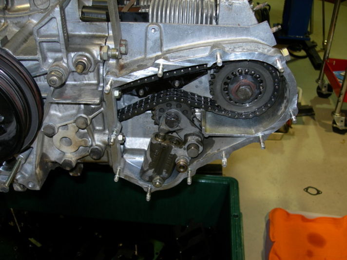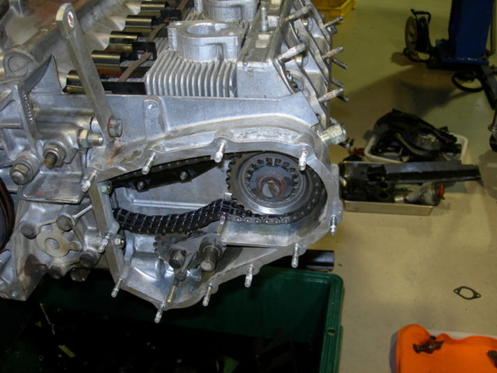 タイミングチェーンの調整です。左右にクランクシャフトから伸びるタイミングチェーン、カムシャフトを回し吸気排気のバルブを開閉させます。