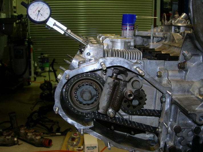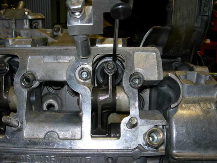 バルブタイミングの調整・・・左右のカムの動きを見ながらバルブの開く閉じる動作を合わせてます。ダイヤルゲージを使い、カムの頂点を探りながら微妙な位置を合わせていきます。言葉にすると簡単ですが、手間隙の掛かる作業です。