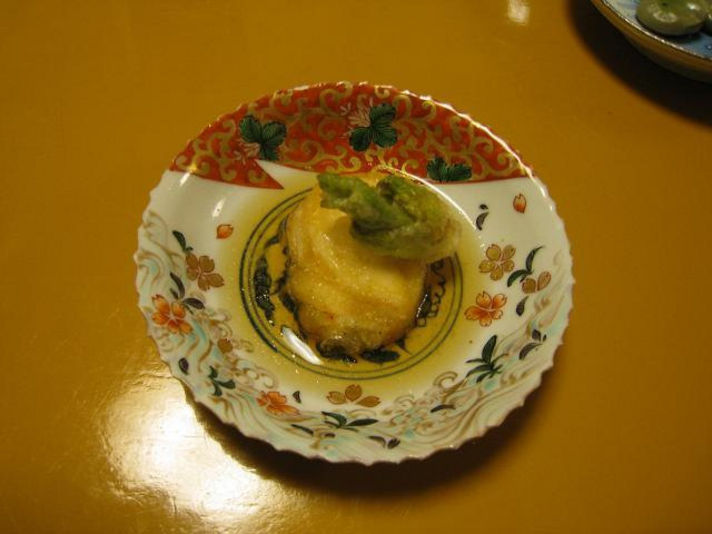 ころもはカラっと揚げ、中はジューシーに上にはたらの芽も添えて出汁を上からかけてだしていただきました。