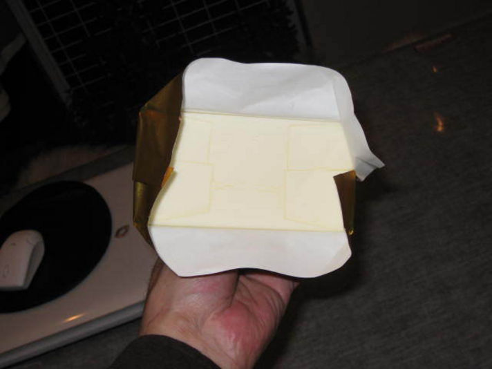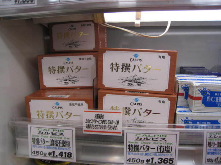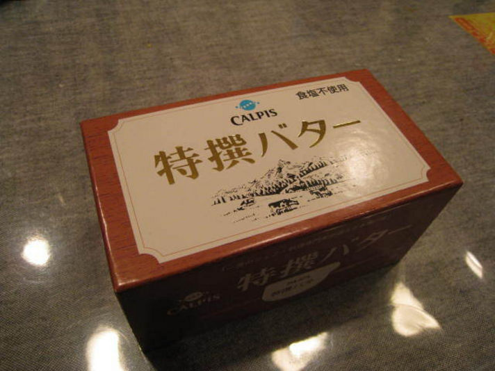 カルピスを作る時に出てくる脂肪の部分を使って作られるバターで、右の写真を見ても分かるようにすごく白いです。 値段は通常のバターの倍します・・・高い