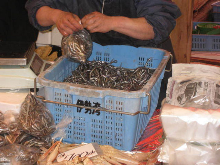 真ん中の写真の魚屋さんに「何時ごろ入ってくるの?」と聞くと