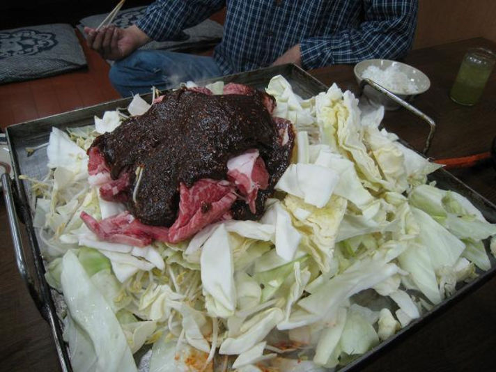 料理の説明 まず40センチ四方の大きな鉄板にサービスの野菜(キャベツ もやし)を鉄板にぶちまけます............豪快...........! そして写真でお分かりいただけると思いますが、次に注文した肉を秘伝の味噌(八丁味噌ベース)とラード(豚の油)を真ん中の写真のように豪快にぶち込み........焼きながら 煮ていき頂きます (三重県は中部地区なのでやはり 味噌ベースですかね)