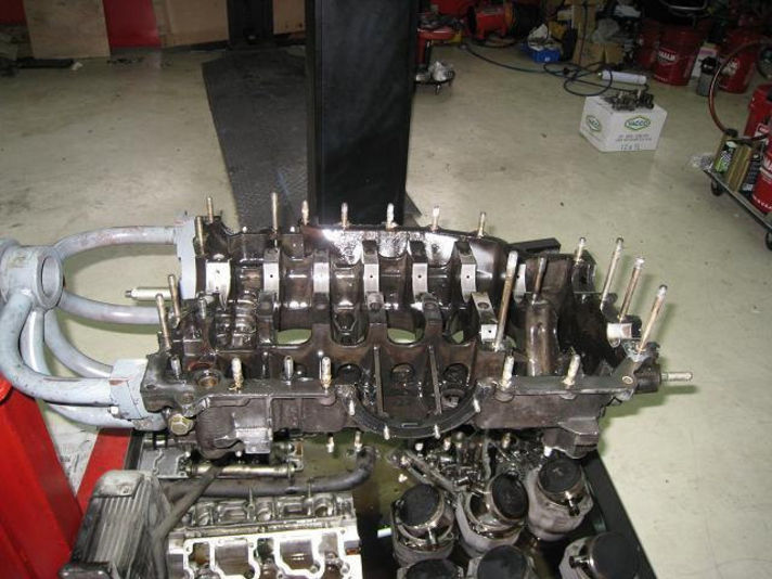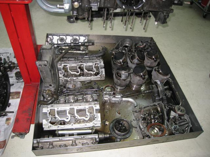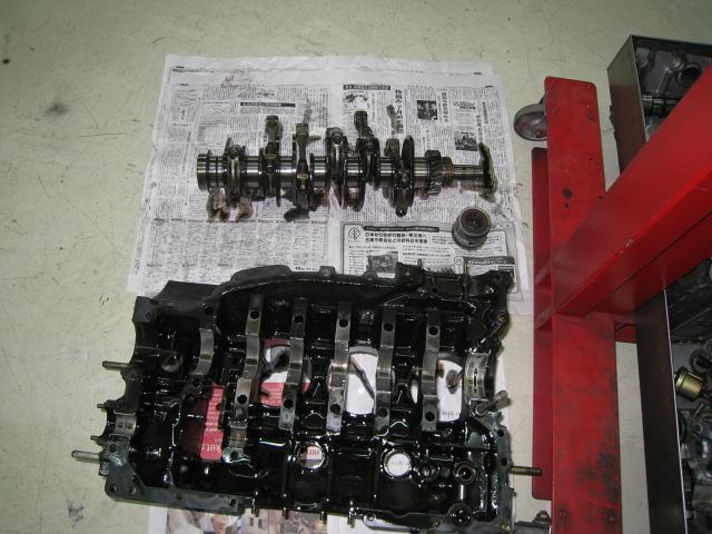 それが写真でお解かりいただけると思いますが、すでにバラバラの状態です。 元々良いエンジンではなかったのでフルにクランクまで分解して、各部分をチェックするとけして良い状態とは言えません・・・。
