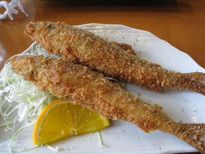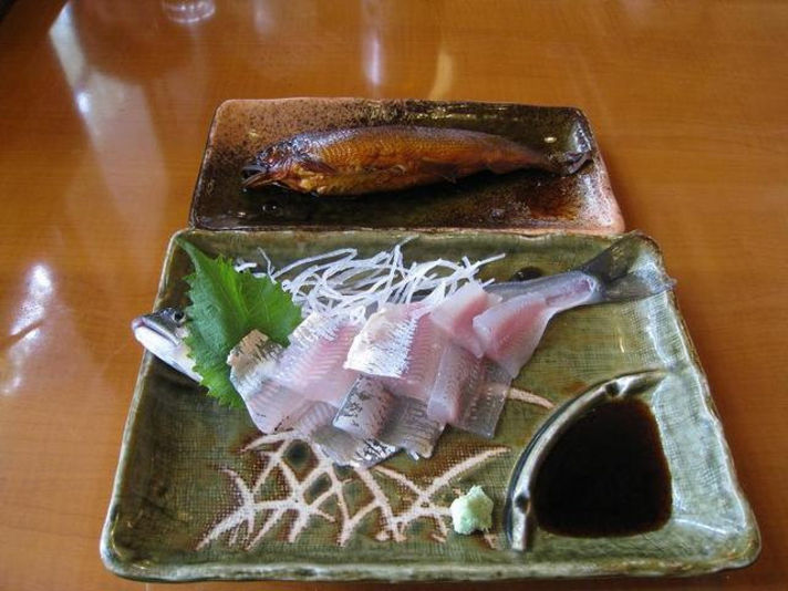 お造り 甘露煮 塩焼き 味噌焼き(写真なし) 右の写真フライ......天ぷらが手間がかかるのでフライ?.....横に置いているとんかつソースで食べる....(笑)