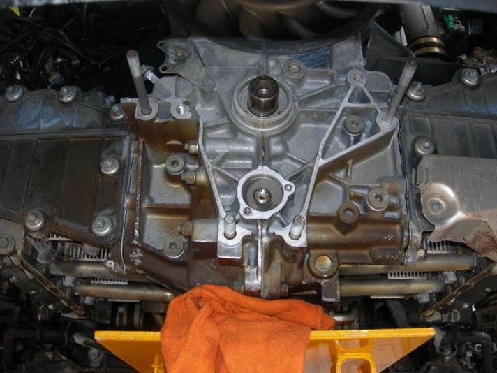 エンジンの後方にベルトを回すプーリーを取り付けるために飛び出しているクランクシャフト部分のシール、その下にオイルポンプを回すシャフト部分の蓋、Oリング交換。結構この部分からのオイルのにじみが発生します。新しくすることで、一安心!