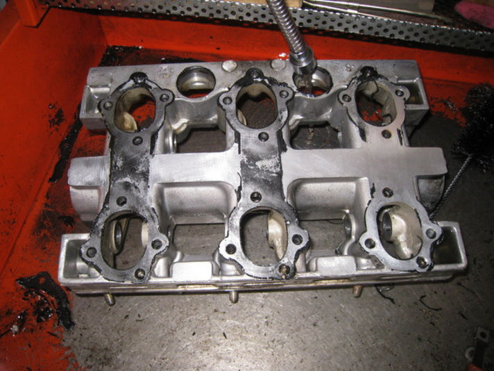 本体以外の沢山の部品も綺麗にして、組み付けけます、メカニックの性格が表れますね!肝心のスルーボルトOリングは、洗い作業が終わってからの進行になります・・・右端の写真は、カムハウジングです、カムシャフト・ロッカーアームの部品が組まれるパーツです。