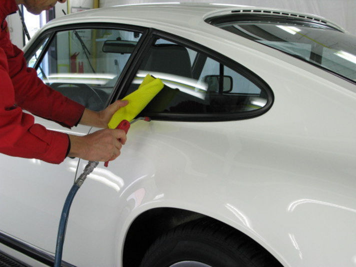 洗車が終わりましたら、エアーブローで水分を飛ばしていきます。拭きあげだけではモールやレンズ類の隙間に残っている水を取りきれませんので、エアーで飛ばしながら拭いていきます。