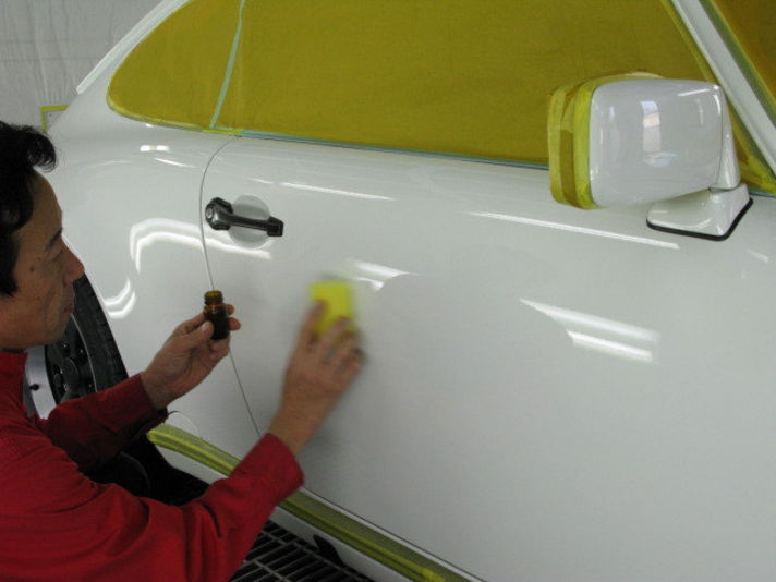 Wコーティングの名前どうりに2種類目のコーティング剤を塗りこんでいきます。ボディカラーにより数種類のコーティング剤から選択します。