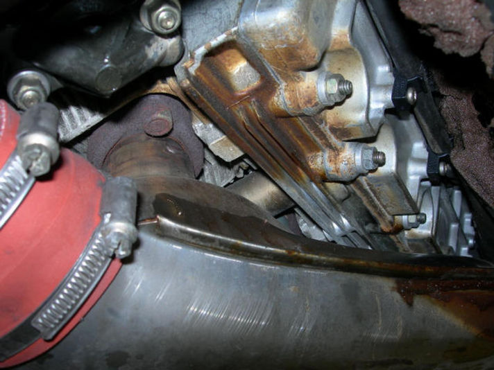 折れたときには マフラーや周りの斜熱版などすべて外さないと交換できません この部品が折れるとプラグコードが痛みエンジン不調につながる