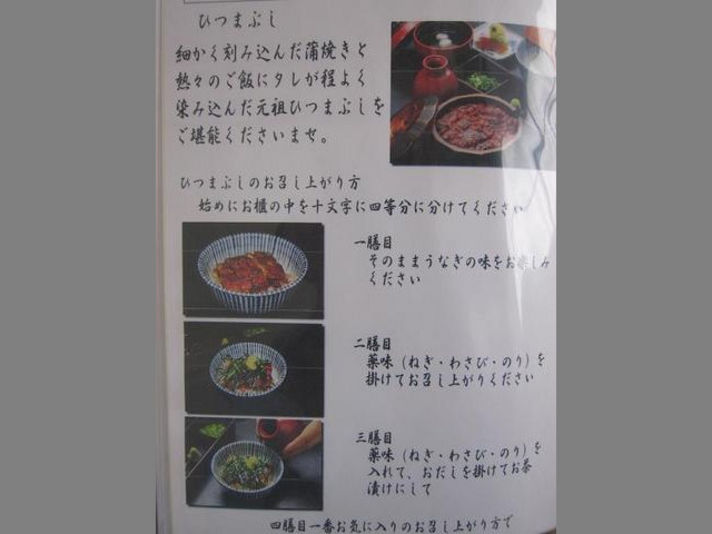 右の写真はひつまぶしの食べ方 一杯目は普通に食べて、二杯目は薬味を入れて食べ、三杯目は再度薬味をふり、ワサビをのせて出汁をかけていただきます。