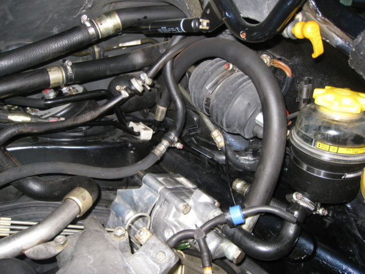 所狭いエンジンルームには、絶妙に配置されたパーツがぎっしりです。配線や配管に気を付けながらの作業です。パイプラインのオイル滲み発見です!パワステオイルのホースです、エンジンルーム右側にきちっと納められたパイプライン・・ステアリングギアボックスからリターンしてリザーブタンクに戻るホースです! 新しいものへと交換しました!”クレヨンいとう”