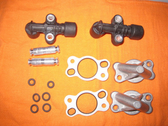 チェーンケースを通りカムハウジングにオイルを送るブリッジパイプです(左写真)カムシャフトに潤滑・油圧タペットにオイルを供給するためのものです。Oリング交換。また銀色のガスケットはチェーンテンショナーのテンショナーホルダー&油圧ラインのガスケットです。