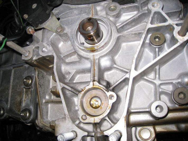真中右の写真は、クランクシャフトシール、オイルポンプ駆動用のシャフトの蓋のOリング交換です。現状漏れは有りませんでしたが、今後滲み出すだろうと思われるため交換しておきます。プラスαのクレヨンクオリティー・・・
