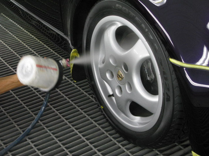 ホイールも同じように吹き付けます。ホイールの塗装面も硬化させますので、ブレーキダスト鉄粉などが刺さり難くなり、掃除がかなり楽になります。