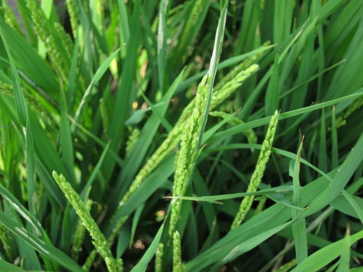 右の写真は・・・なんと、お米ができています! まだ緑で、頭を垂れていませんがしっかりとお米が実っています・・・これが私たちの食卓にならぶんですねえ・・・ |