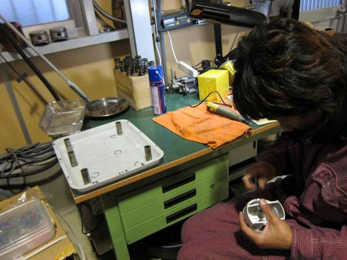 真中写真 メカニック藤本 ピストンとピストンピンの精度をみています