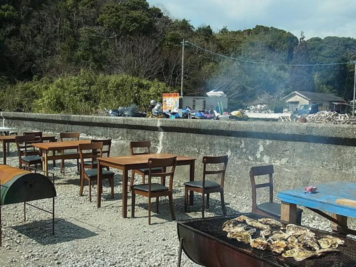 左の写真はカキと左奥に見えるのは乗ってきたバイクです