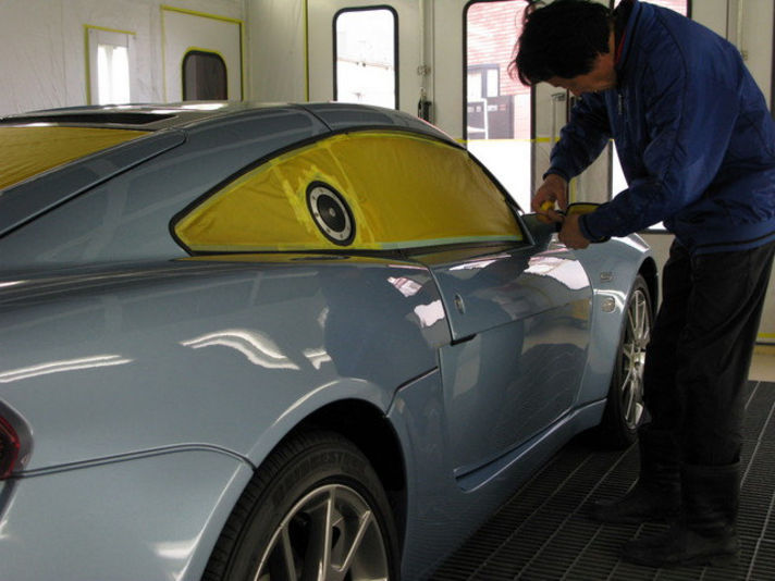 ミラーやウィンドウなど磨かない箇所はマスキングしていきます。