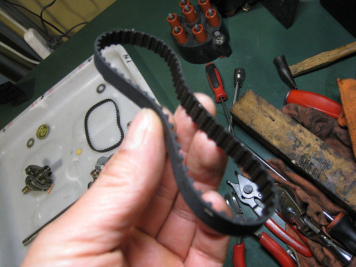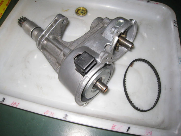 964はツインプラグになって、電気を分配する為のデストリビューターがベルトで駆動する二軸式になっています、その為ベルトが切れるトラブルが発生するようになりました。 切れる前の予防整備・・・クレヨンクオリティー