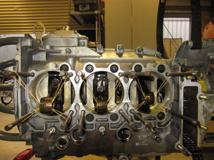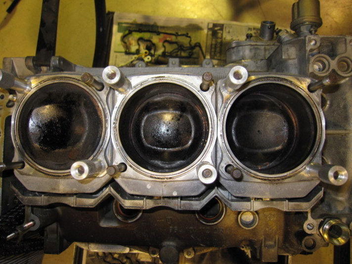 右の写真、全てのシリンダー、ピストンを取り外した状態です。