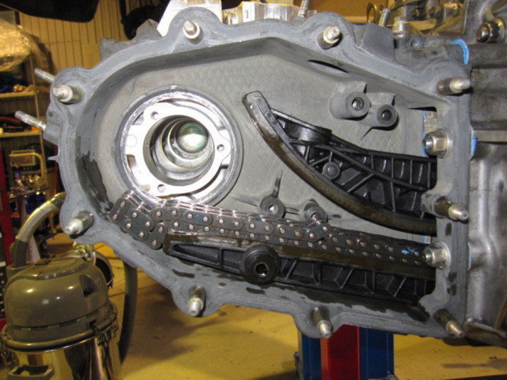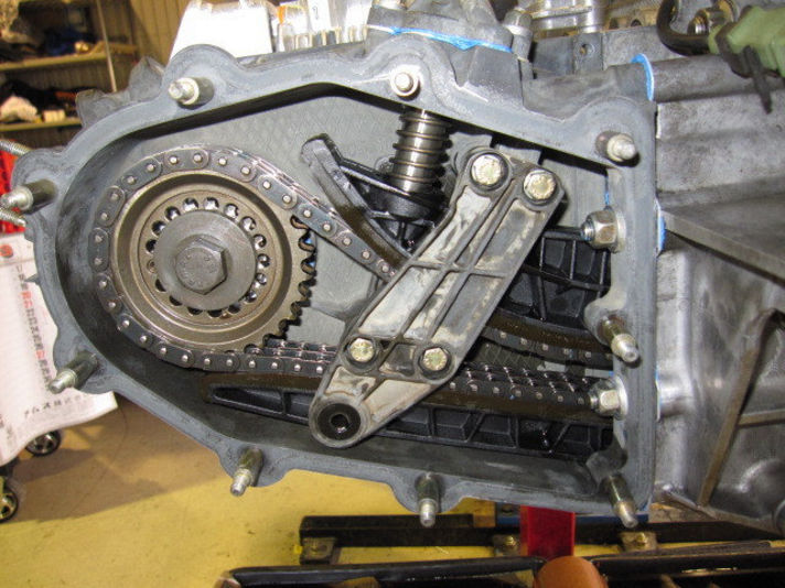 左の写真、チェーンケースを取り付けチェーンガイドを入れたところになります。この後、カムシャフト、スプロケット等を仮に取り付けて規定値にスプロケットの調整を行います。