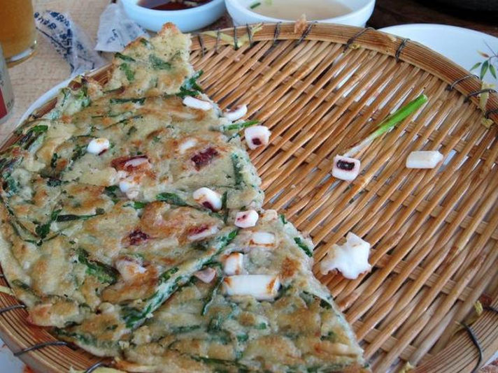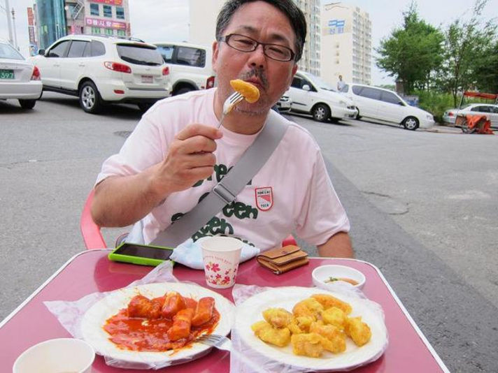 まず左の写真から チヂミです。 お昼ご飯は全部ついていましたが、ほとんどのお店で追加でチヂミのオーダーが入れられます。 結果 三回チヂミを食べましたが、二日目のお昼に食べたものが一番おいしかったです。 ジャガイモの粉を使ったチヂミです。 食感がパリッと、そして意外にあっさりと、そのままでも美味しかったのですが、つけだれをつければなお一層おいしかったです。 次に三日目の晩御飯の後 街を探索中に屋台を発見(笑) そこで韓国のファーストフード トッポキを食べなければいけないと思い、いただいたところ非常に美味しかったです。 辛いのですが、甘さも程よくトッポキの食感も適度な柔らかさと歯ごたえ、茹で卵、おでん(おあげみたいなもの)も美味しく、海鮮のてんぷら(フリッター)もなかなかイケました。