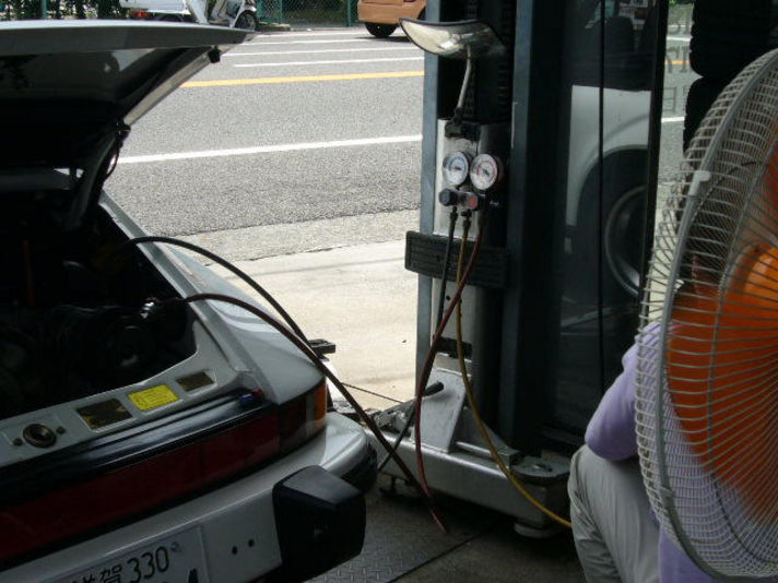 空冷ポルシェは水冷に比べかなりACの効き悪く 特に930系はエンジンの上にACのコンデンサーが付いているため 当然車が止まっているときは 風が当たらずエンジンの熱気で 冷えない状況になります 964以降のモデルはコンデンサーがフロントに移動し 電動ファンで止まっていても風を強制的におくるため930に比べて かなり冷えるシステムです どちらも最近の暑さには空冷ポルシェにとって 良い環境では無い事は事実てず 写真はACガスの補充風景です 大型扇風機はポルシェを走る状態を作り ガスを補充する裏技です 空冷ポルシェのガスを補充する時にはポルシェの知識の無いところで 作業すると痛い目にあいますので注意してください 私も昔は痛い目にあった一人です |