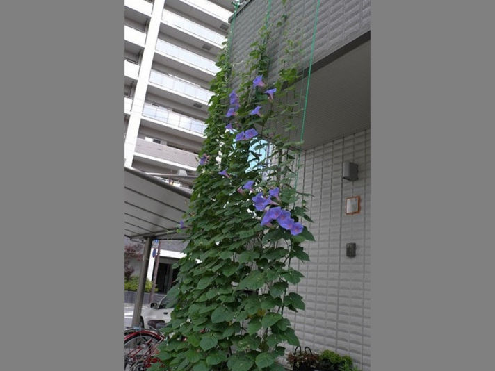 朝顔の緑のカーテン、なんと……もう少しで頂上(ベランダ)に届きそうです。