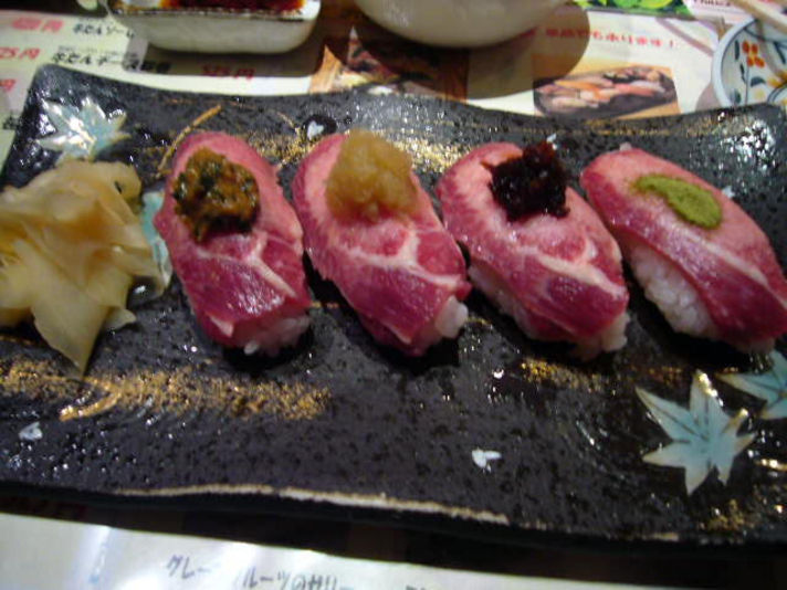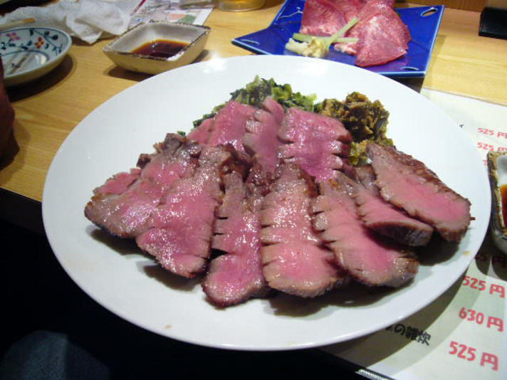 先日のGTICUPで仙台に行き私の趣味の一つである 美味しい物さがし まずは 泊まっているホテルのフロントの人に情報収集からスタート 聞くところによると一番有名な店は 太介 しかしそのお店は アルコール類を一緒に頼まないと食べさしてくれないとの うわさ? 二番目が今回紹介するホテルから歩いてすぐ利久です 私の行った時間は夜7時台でほぼ満席状態です メニューをひととおりみて 限定一日50食の文字にひかれ 一人前1480円の極を注文 タンの御すしを注文しました 写真の極はタンを約一センチの厚みに切り 縦横に 包丁を入れ食べやすく食感をだし 最後に斜めにそいで切り落としています 味付けは塩コショウ 炭の網焼きで調理し 山葵の効いたお漬物と一緒に 食べます 握りすし 写真のように肉の上にそれぞれ違った薬味を載せてあります 当然そのままいただきます 薬味は抹茶塩 昆布 おろしポン酢 からし葉 ? 味は普段近江牛を食べていますが値段の割には十分美味しいでした 写真の極は二人前です 一人前150〜180グラム有り |