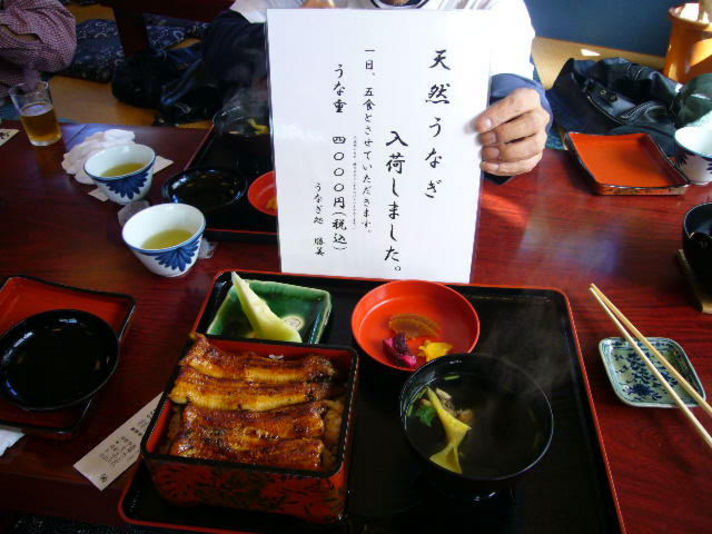写真は浜名湖での記念撮影と浜名湖で食べた一日五食限定のうなぎ丼税込み4000円(フンパツ)ちなみにノーマル2200円友人の少し交換し