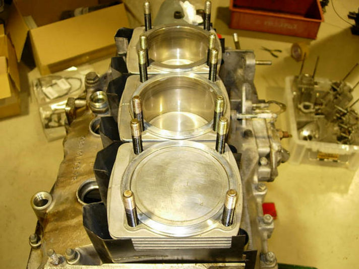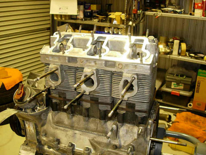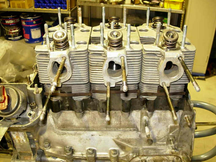 シリンダーの上に、バルブヘッド、カムハウジングとお重の様に重ねていきます 精密に加工された各部品、三つのシリンダー&ヘッドの高さが同じでないと、カムハウジングに隙間が出来ることになります。しかもヘッドとカムハウジングにはガスケットは有りません。