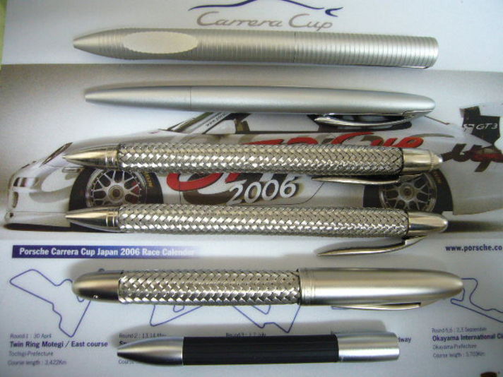 去年の年末に 今まで愛用してきた ボールペンのつば(?)が写真のように 開きポケットにかからず 新しい物に買い替えを考えていました 真中の写真は 私のポルシェデザインのペンのコレクションてですが 一生懸命働いた 大人のご褒美のポルシェの.注文書にサインを頂くに あたり 私のこだわりとして今回新たに.最後の写真の物 以前の物のステンメッシュのものにゴールドが少しアクセントに入ってる 少しセレブの物をチョイスしました これも クレヨンのこだわり(でた自己満足) |