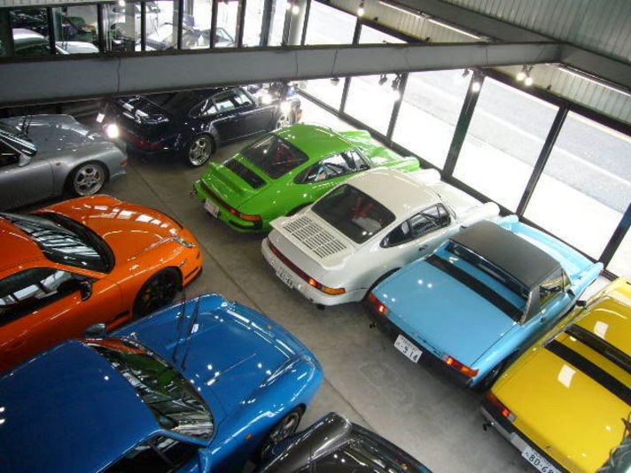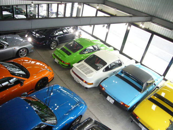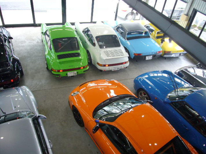 997GT3RSのオレンジがショールームに入り 明日納車予定の914のスカイブルーと私の74カレラ 914―6のライムグリーンとイエロー